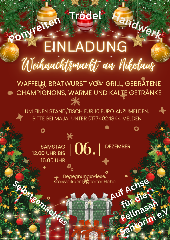 Zum Jahresende planen wir wieder einen gemütlichen Weihnachtsmarkt mit handgefertigten Geschenken, Leckereien und einer Fotosession mit unseren Pferden. 🎄