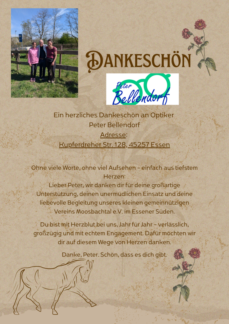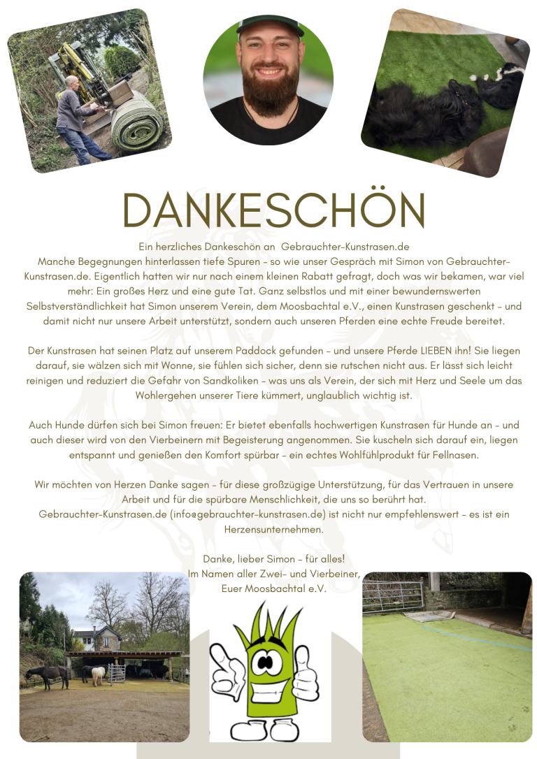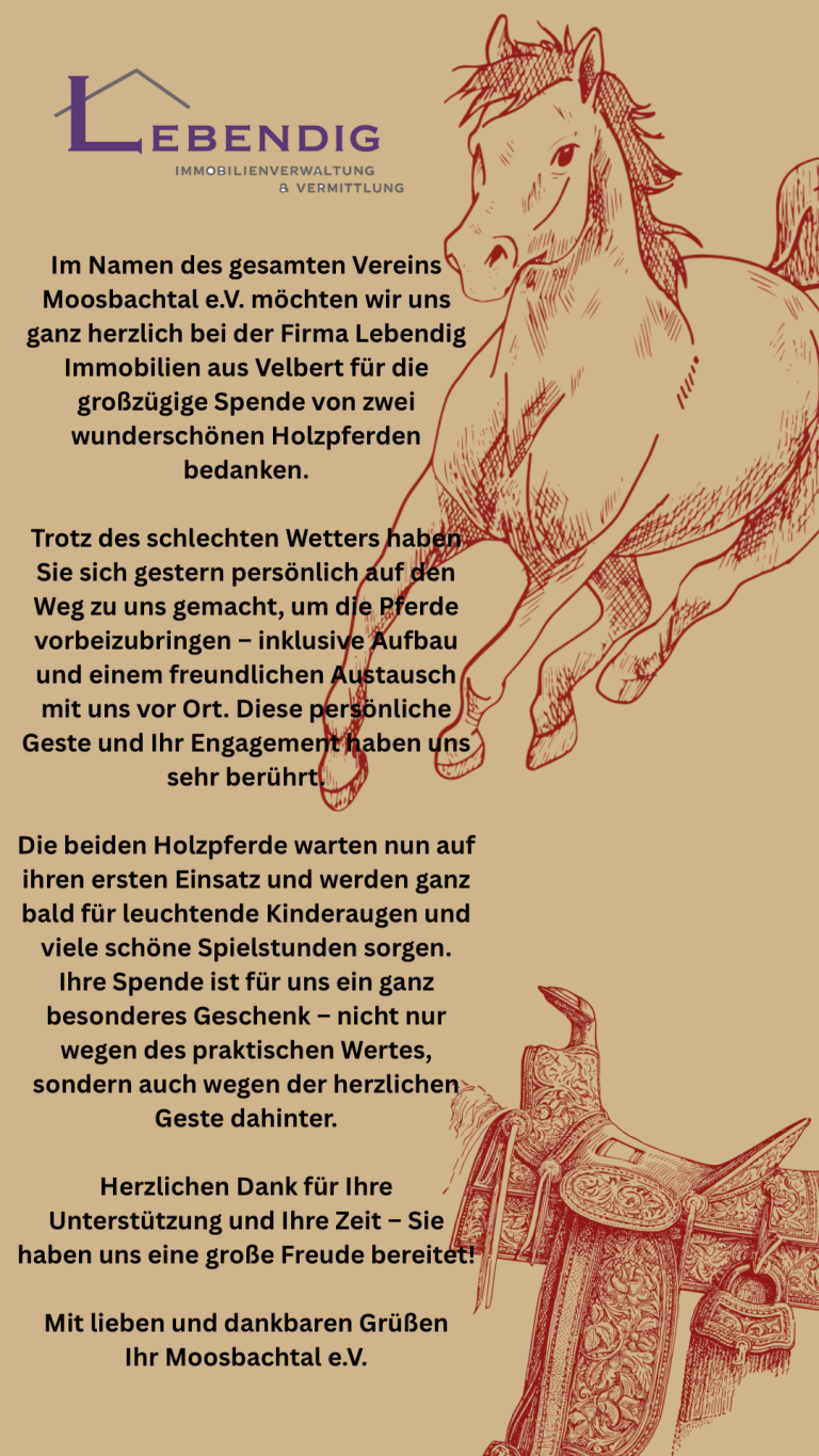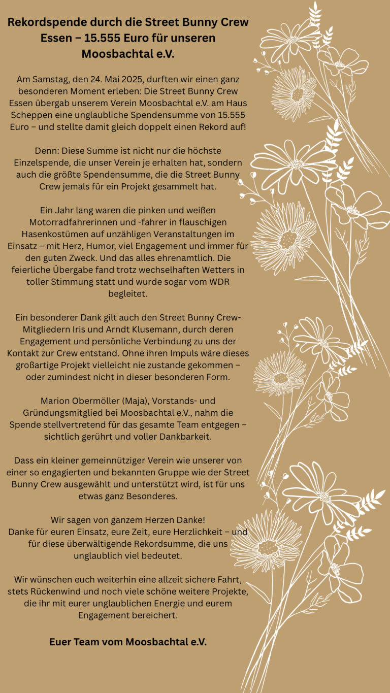 Der Verein Moosbachtal e.V. bedankt sich herzlich für die großzügige Spende, die zur Unterstützung ihrer Projekte für Mensch und Tier im Moosbachtal beitragen wird.
