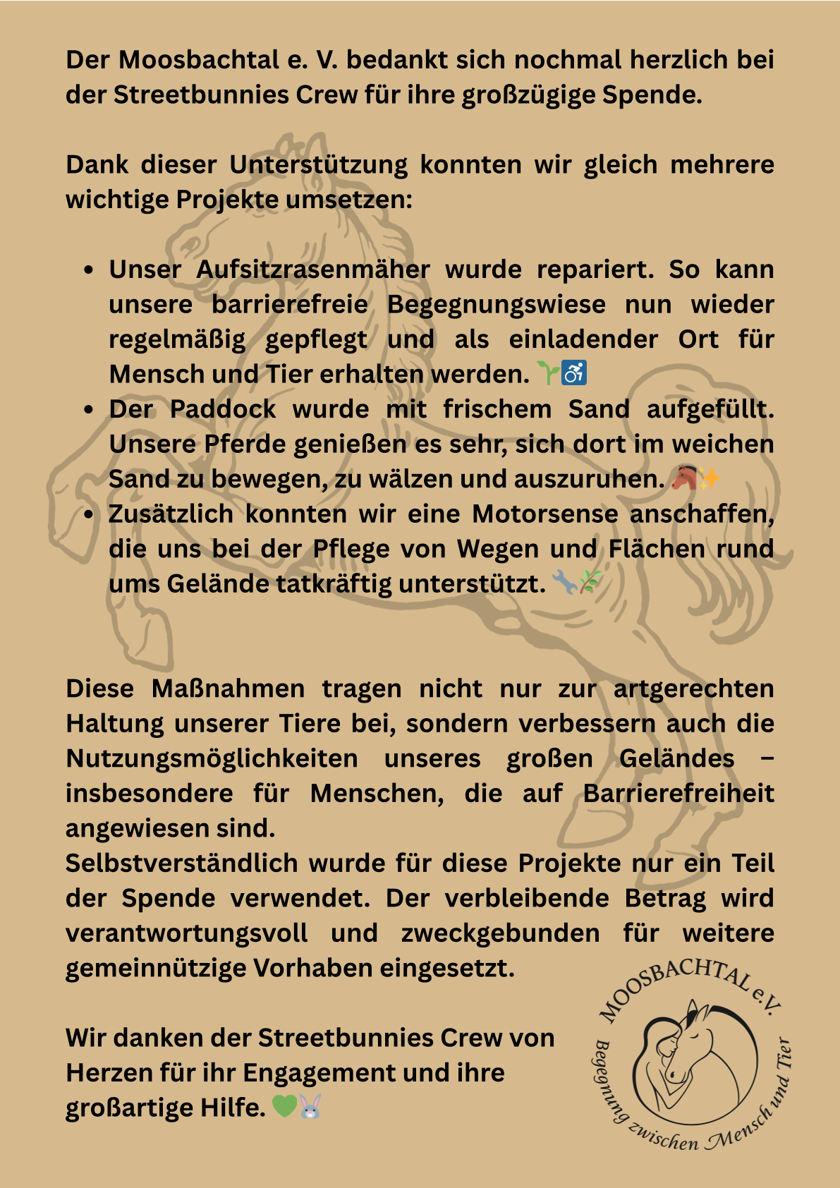 Das bedeutet: Jede Aktion der Streetbunny Crew unterstützt direkt unseren Verein und unsere Arbeit für die Ponys und Pferde im Moosbachtal e.V. 💚